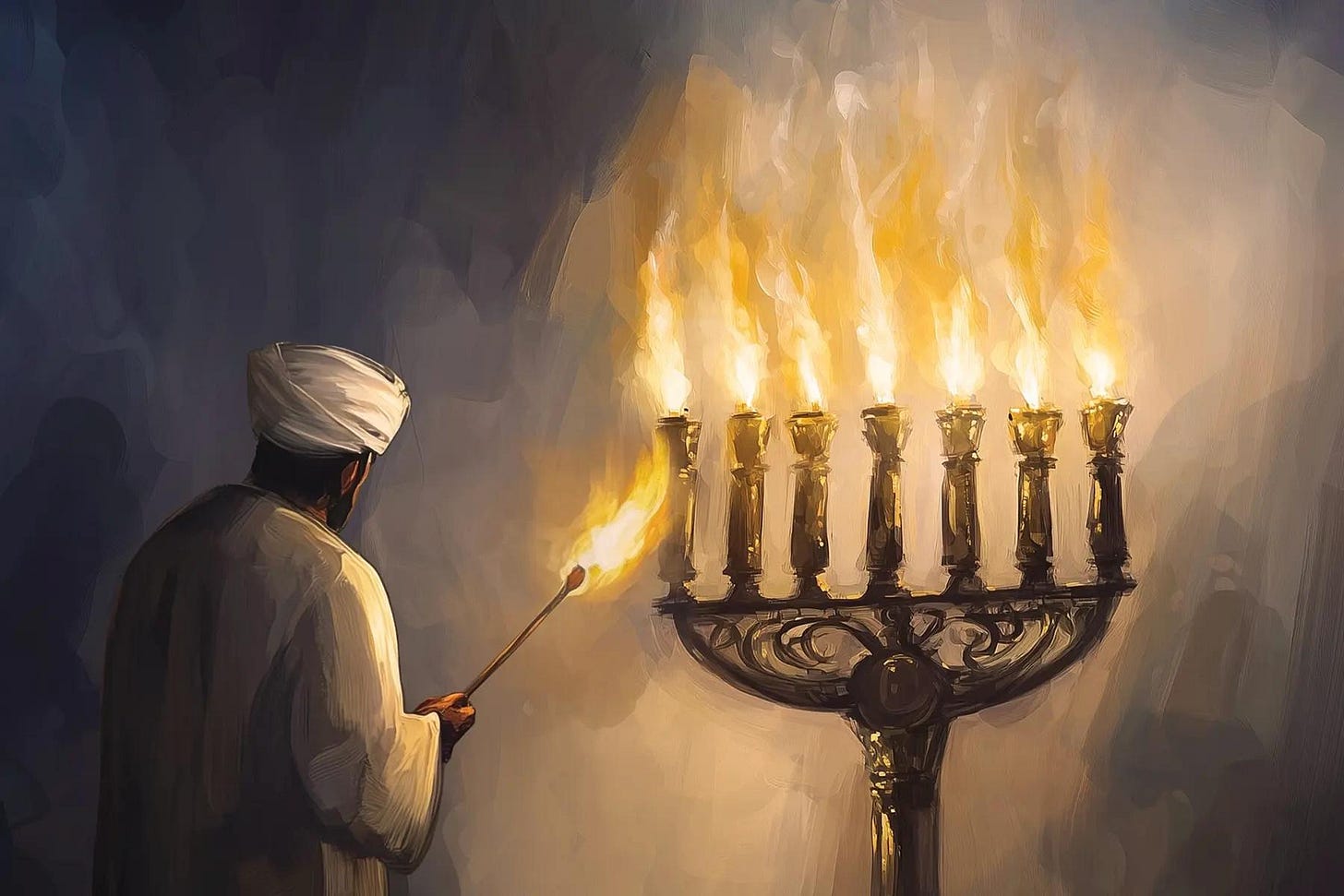 Siglos después, el profeta Zejariá/ Zacarías tiene una visión: un candelabro de oro alimentado por dos olivos, uno a cada lado. Cuando pregunta qué significan, la respuesta es: