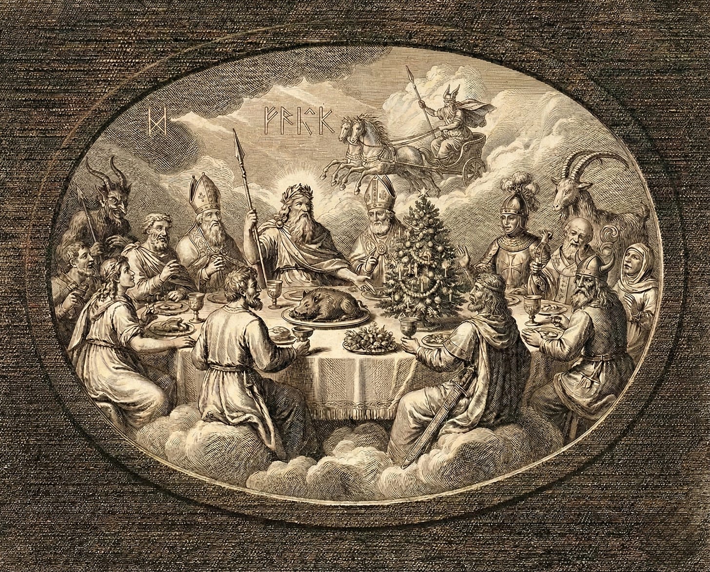 El Jabalí de Yule y el Jamón Navideño: el plato central de la cena navideña en muchas culturas, el jamón del cerdo (animal inmundo: cf. Lv 11), tiene su origen directo en el Jabalí de Yule (Sonargöltr). En la mitología nórdica, el jabalí era el animal sagrado de Freyr, otro dios nórdico de la fertilidad y el sol, emparentados con Odin. Durante el Yule, se sacrificaba un jabalí en su honor. Antes del sacrificio, los guerreros y hombres libres ponían sus manos sobre las cerdas del animal y hacían juramentos solemnes de hazañas que cumplirían en el nuevo año. Este rito de “juramento sobre el jabalí” es el antecedente pagano de los propósitos de Año Nuevo. El consumo de la carne del animal sacrificado permitía a los participantes absorber la fuerza divina de Freyr. La Iglesia, al no poder erradicar esta costumbre culinaria tan arraigada, la permitió, y el jamón de Navidad se convirtió en un elemento básico, irónicamente utilizado más tarde en España y otros lugares como prueba de fe para distinguir a los “cristianos viejos” de los conversos judíos o musulmanes que no consumían cerdo.